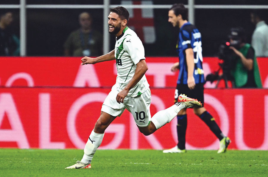 PENYERANG Sassuolo Domenico Berardi berlari melakukan seleb-rasi di stadion San Siro di Milan, Rabu (27/9).