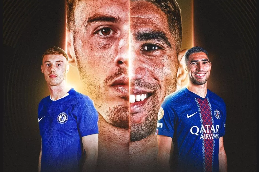 Bintang Chelsea, Cole Palmer (kiri) akan berhadalan dengan Achraf Hakimi, pemain belakang PSG pada Final Piala Dunia Antarklub 2025. (DAZN)