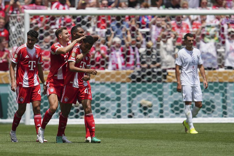 Skuad Bayern Munchen merayakan gol Jamal Musiala ke gawang Auckland City, Minggu (15/6/2025) waktu AS. (F. AP Photo/Jeff Dean)