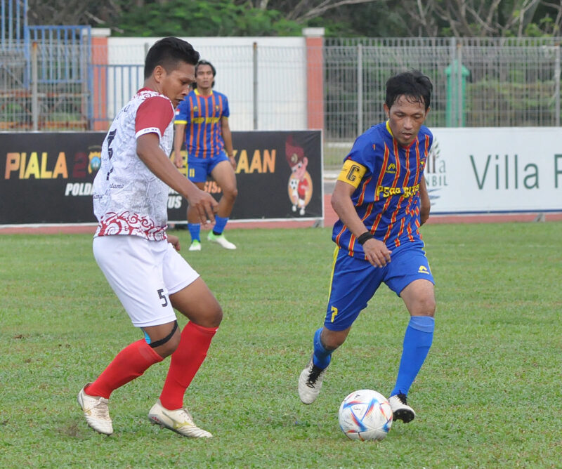 Pemain PS BP Batam (biru) berusaha melewati hadangan pemain PS Natuna (putih) dalam penyisihan Grup D Piala Kemerdekaan di Stadion Citramas, Kamis (14/7). F. Ryan Agung/Batam Pos